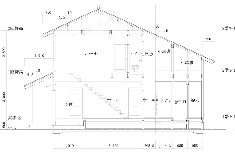 建物を真横から見たとき、外側が透明になって、建物の内側を見られるような図。専門用語では「断面図」と言われています。