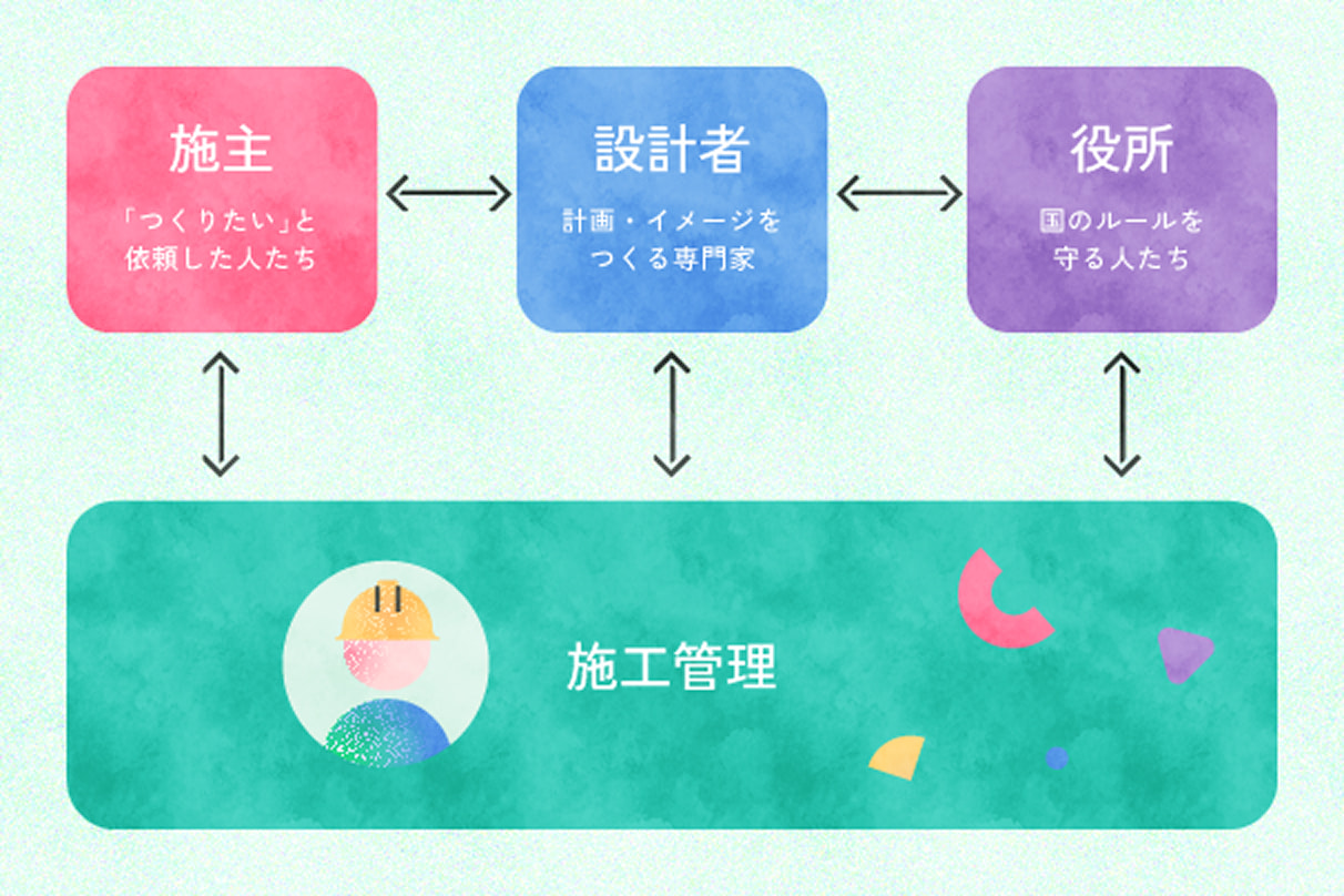 工事が始まる前から建物が完成するまでの「工事のまとめ役」としてかかわっていくことが役割です。